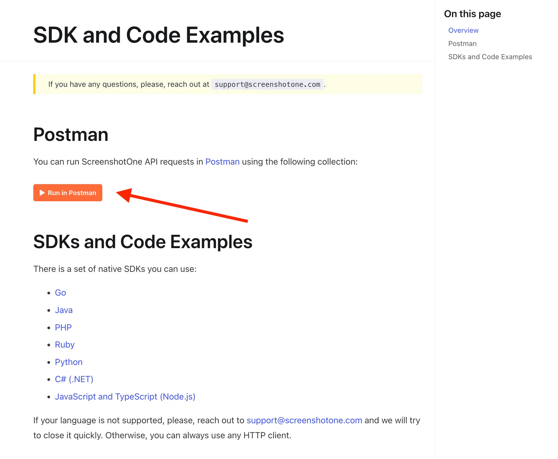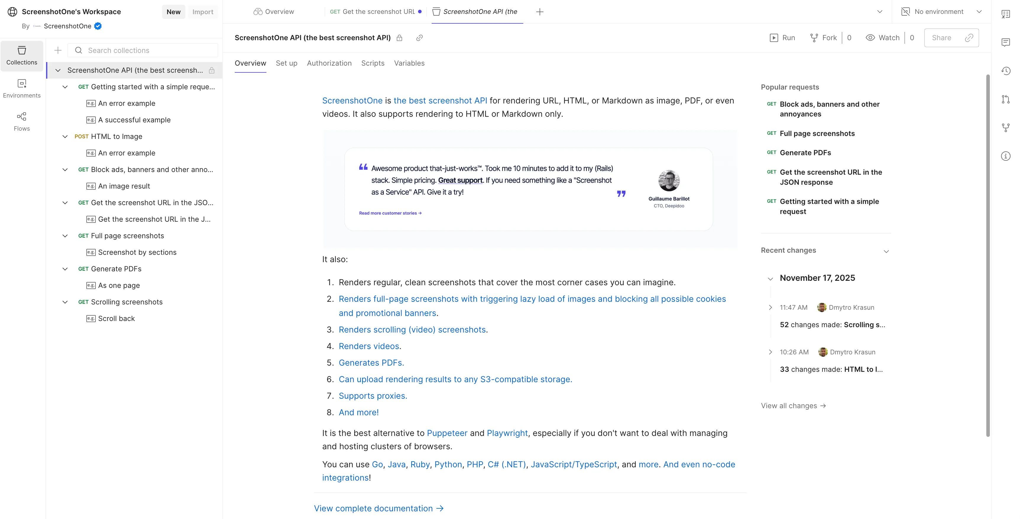 ScreenshotOne is a verified publisher and available on the Postman API Network.