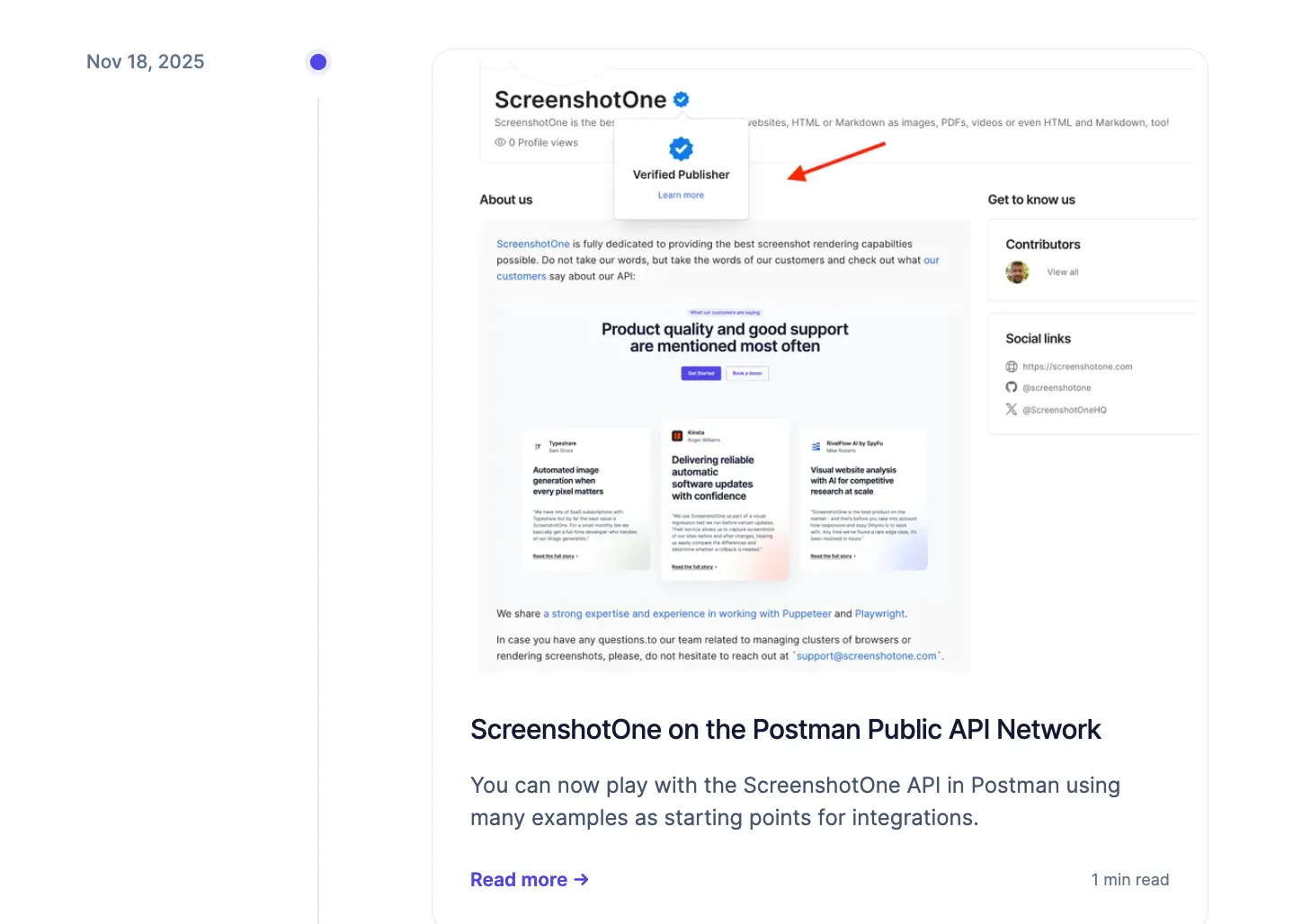 In the post, I share why it is worth publishing your API and become verified on their network and how I achieved that with ScreenshotOne.