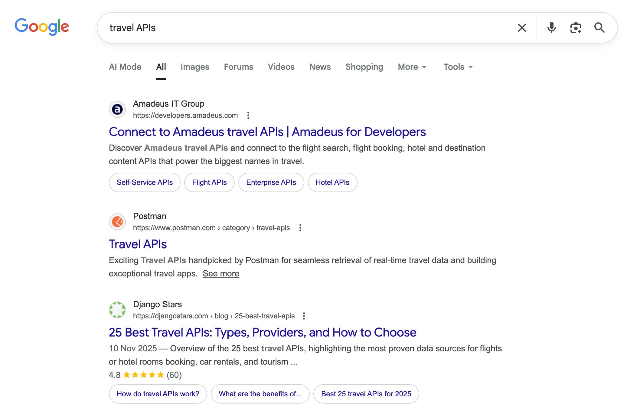 But not only other developers might find your API through exploring the network, it might be ranked higher on Google, Bing and even have higher chances to be recommend by ChatGPT, Claude and other AI platforms for certain keywords. For example, if you search for “travel APIs”, Postman is ranked the second: